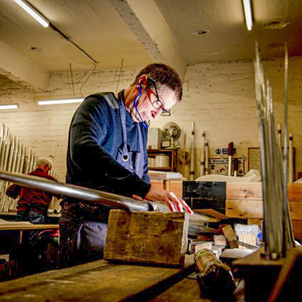George Fowler cutting pipes out from 50/50 tin and lead sheet spotted metal. Picture: Tony Johnson
